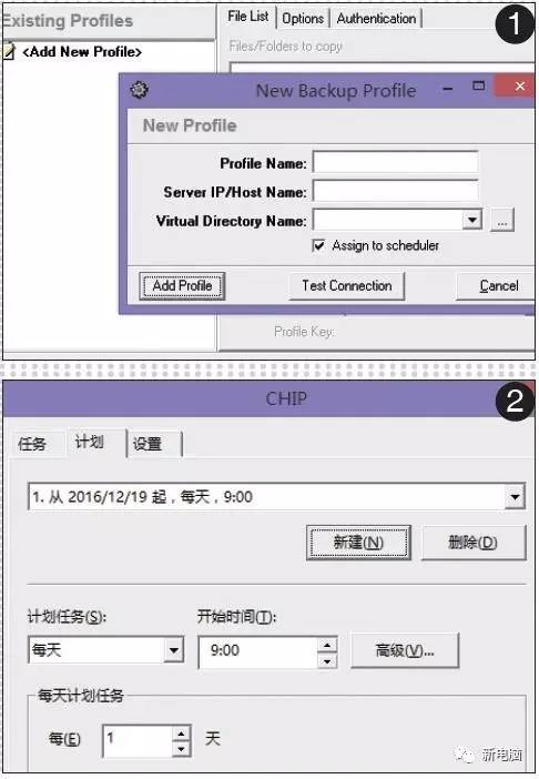 如果与服务器的连接检测正常,那么在DeltaCopy客户端“Virtual Directory Name”下选择已在服务器中创建的目标目录并为配置文件起一个名字。现在,返回客户端主界面,选择配置文件开始备份工作:在“File List|Add Folder”中指定要备份的目录,完成该设置后单击“Modify Scheduler”,Windows调度程序将打开并自动创建一个新任务。在调度程序窗口中,单击切换到“计划”选项卡,单击“新建”即可根据自己的需要选择自动备份执行的时间和时间间隔,一般情况下,对于数据备份,可以按照默认的设置每日进行备份即可。