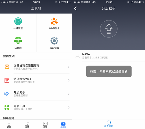 以小米路由器的APP“小米WiFi”为例,在APP“工具箱”页面直接能看到“升级助手”,点击即可查看当前路由器的固件版本,如果有更新直接点击更新即可。这也是智能路由器最方便的地方,虽然很多智能路由器在作为路由器最基本的穿墙性能、WiFi速度、信号稳定性等方面不如传统的非智能路由器,但在固件升级、接入设备管理等方面还是拥有很大的优势。