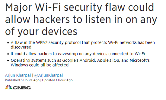 比利时研究人员表示,用于保护WiFi网络安全的保护机制(也就是WPA2安全加密协议)已经被黑客攻破,安全专家Mathy Vanhoef表示:“该漏洞影响了许多操作系统和设备,包括Android,Linux,Apple,Windows等。”这说明几乎在一夜之间,你能连上的WiFi,包括你自家的路由器,全部都处于风险之中,你的网银、账户密码、聊天记录、照片、电子邮件等都有可能被黑客窃取,最安全的方法当然是不用WiFi,完全依靠4G流量上网,不过这显然不是什么长久之计,等待科技公司发布补丁并更新才能确保网络安全,包括微软、谷歌、苹果等发布的系统更新和路由器厂商发布的固件更新。