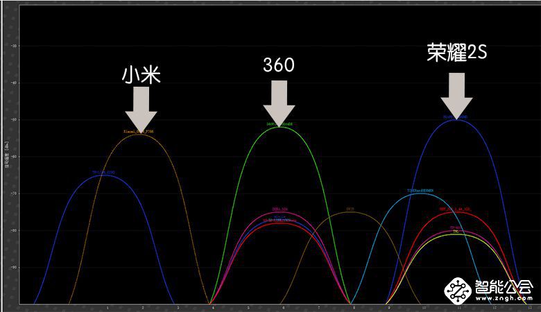 首先信号强度可以看到荣耀路由2S依然接近满格,这是非常惊人的,而小米和360明显下降几乎淹没在其他路由器的信号中。