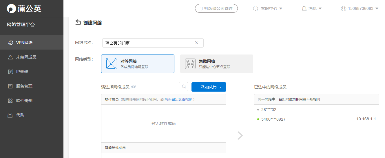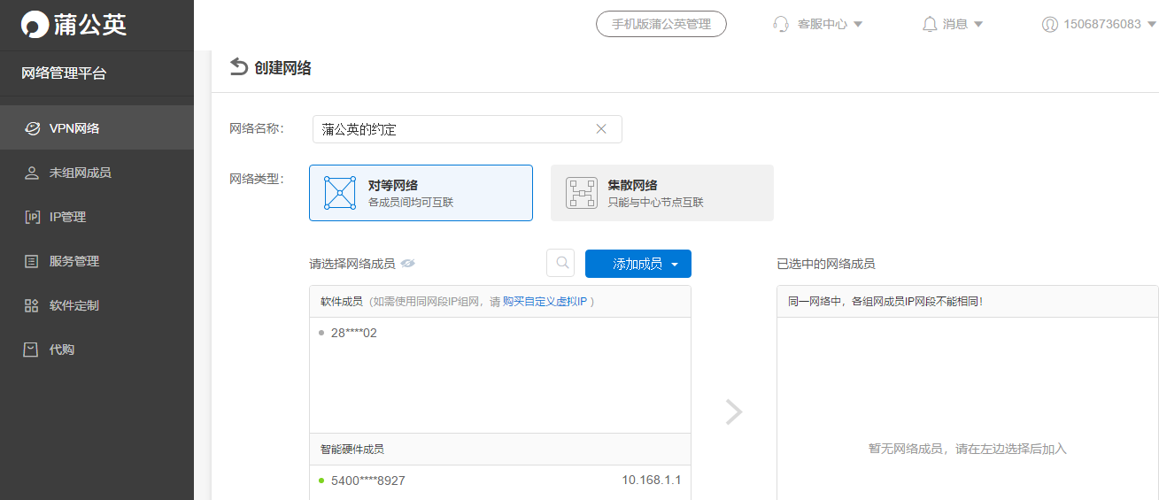 蒲公英路由器的一大特色功能就是智能组网,操作步骤也简单易上手,在进入管理控制台之后,将设备的SN序列号添加进去,再添加客户端成员就可以进行智能组网组网了。