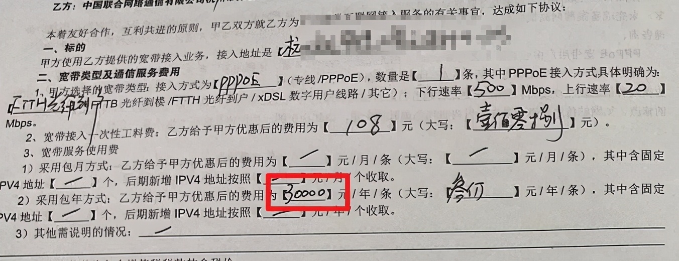 然而安装地点从住宅小区改成了企业园区之后,资费就从 1280 元暴涨到了 30000 元。