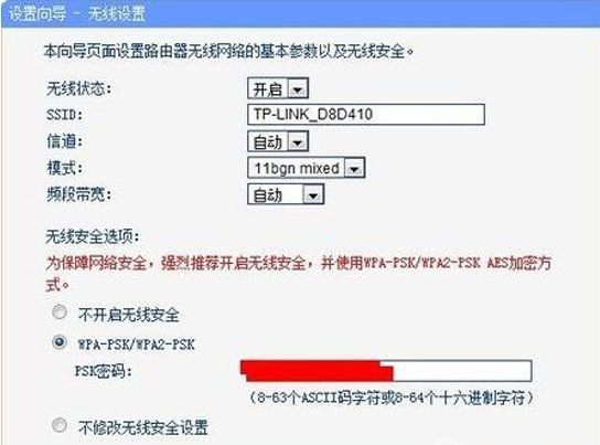 点击下一步后,进入到设置向导无线设置页面内,我们会看到无线状态、SSID、信道、模式、频段带宽等几个选项,基本上不用我们去调整,SSID就是你的无线网络的名称,可以根据你自己的需求进行调整,下面的无线安全选项建议大家开启,即选择wpa-psk/wpa2-psk这一选项,PSK密码就是登陆你的无线网络时需要输入的密码,可以设置为常用的个人密码,为了防蹭网,也可以不定期的更改这一密码。
