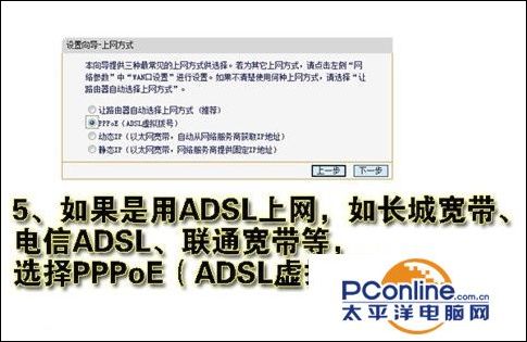 3、选择设置向导之后会弹出一个窗口说明,通过向导可以设置路由器的基本参数,直接点击下一步即可。下一步选择上网方式,通常ADSL用户则选择第一项PPPoE,如果不知道该怎么选择的话,可以直接选择第一项自动选择即可,选完直接点击下一步。