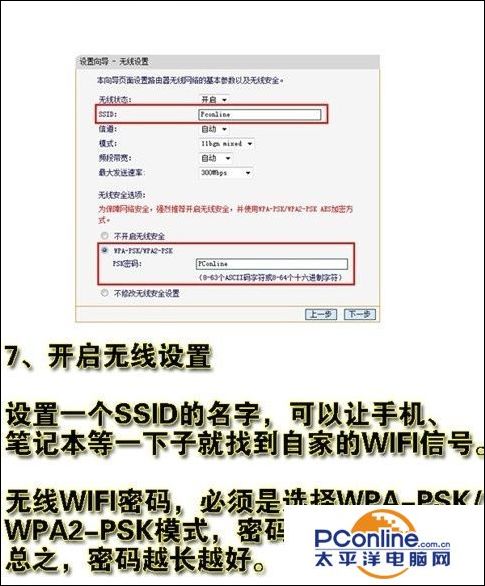 5、为了确保自家无线网不被他人随意使用你的无线网络,这时你需要给你的无线网络设置安全密码。找到【无线设置】-【基本设置】,在【SSID】中填入你的路由器的名字,自己随便填写,用于识别自己的网络。密码尽量复杂一点,防止被蹭网。设置完成点击下一步。