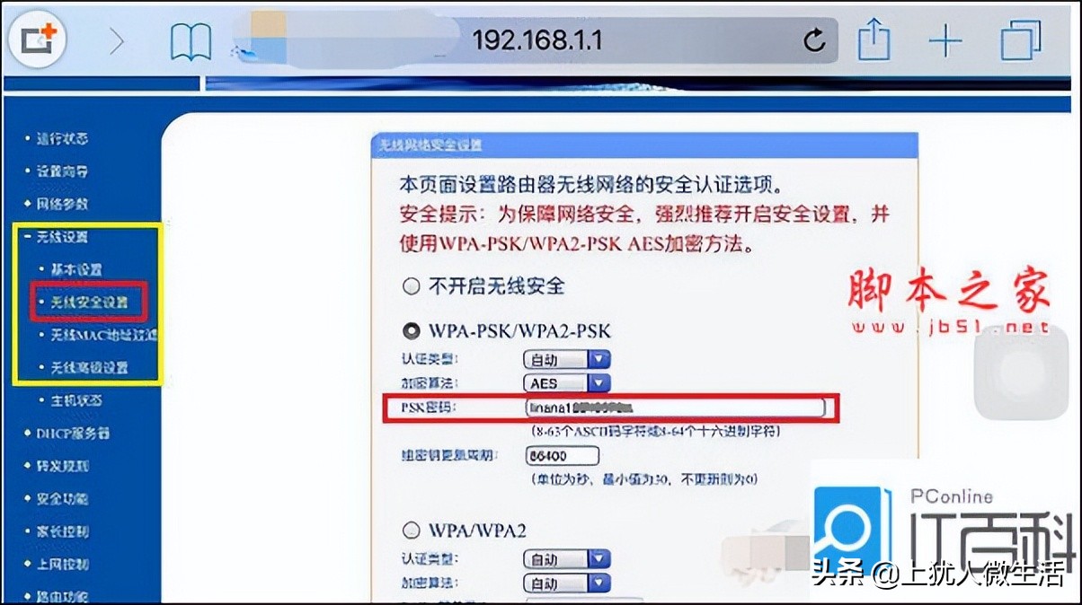 3、登录路由器管理界面后,看到的界面与电脑中设置路由器是一样的,然后展开点击左侧的无线设置->无线安全设置,然后在右侧就可以看到PSK密码,这个就是Wifi密码,将这个密码改成一个新密码,完成后点击底部的“保存”就可以了,如下图。
