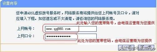 4、 这一步是至关重要的,那就是输入电信运营商为我们提供的账号和宽带密码,路由器到此就设置完成了