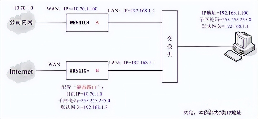 在一个公司网络中,需要不仅可以通过无线路由器B连接外网,还可以通过无线路由器A来连接公司内网服务器。在不修改本地连接的IP地址及网关情况下,公司电脑需要能够同时访问外网和内网服务器。配置实例如下图: