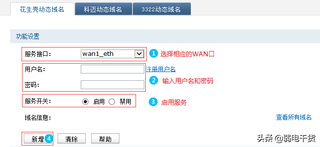 新界面支持三种动态DNS,以花生壳为例,设置方法如下: