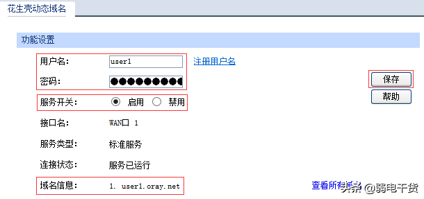 点击 系统服务 >> 动态DNS,输入花生壳的用户名和密码,服务开关选择 启用,点击 保存。登录成功后,在 域名信息 中看到花生壳域名。如果您没有花生壳账号,可以点击 注册用户名 进行注册。