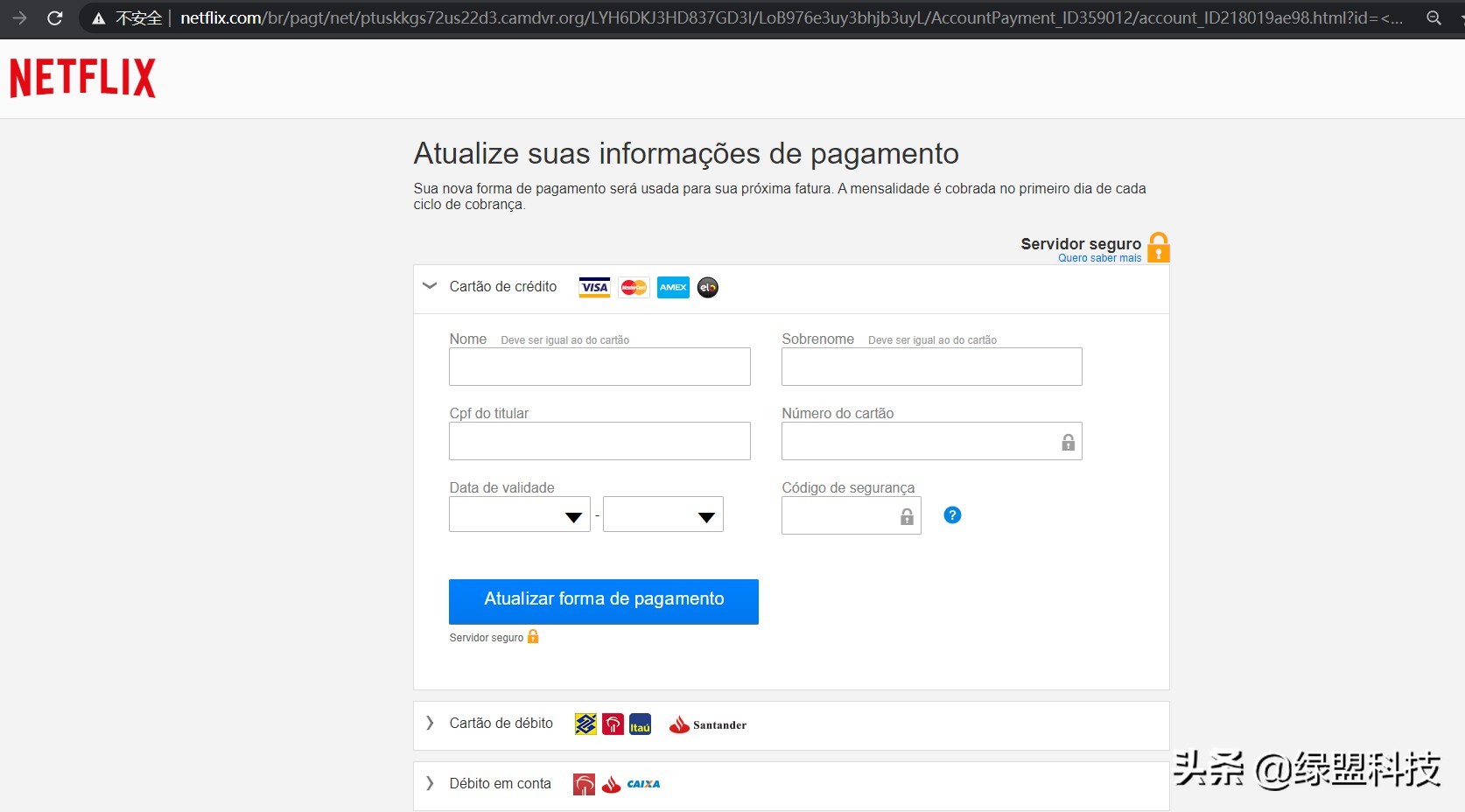 点击登录后要求输入邮箱和密码,提示用户被暂停,需要验证账户,要求输入银行卡信息,包含名、姓、CPF、卡号、签发日期、CVV码。随意输入后提示成功。