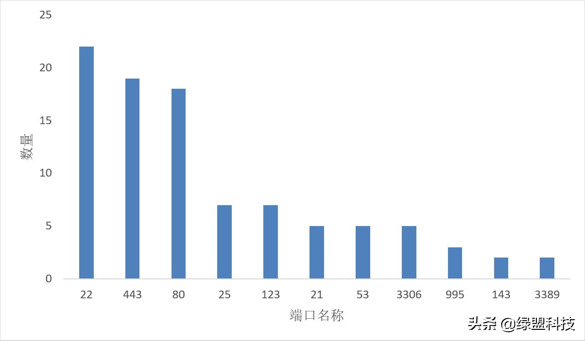 图 2.2 是攻击源主要开放的端口的分布情况,这些攻击源中,大部分开放了22、443和80端口。
