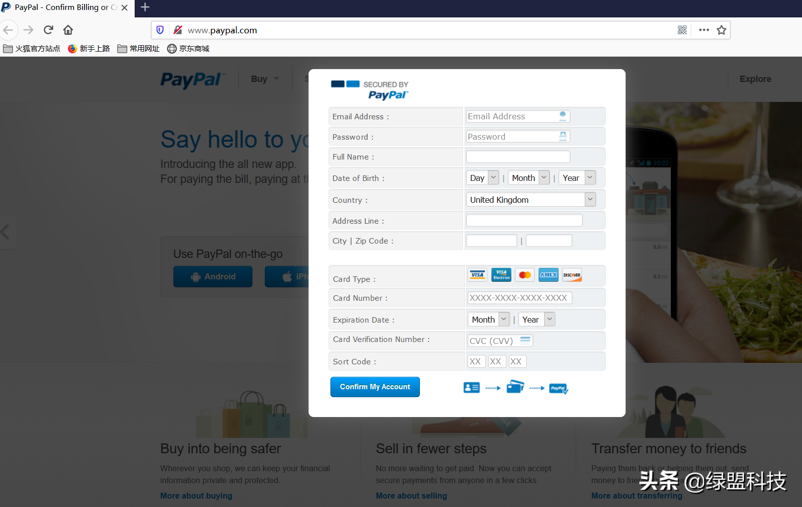 图 2.7 是攻击者伪造的PayPal页面,主页显示英文界面,点击登录,要求输入邮箱、密码、全名、生日、国家、住址、城市、邮编、银行卡号、签发日期、CVV码、密码。