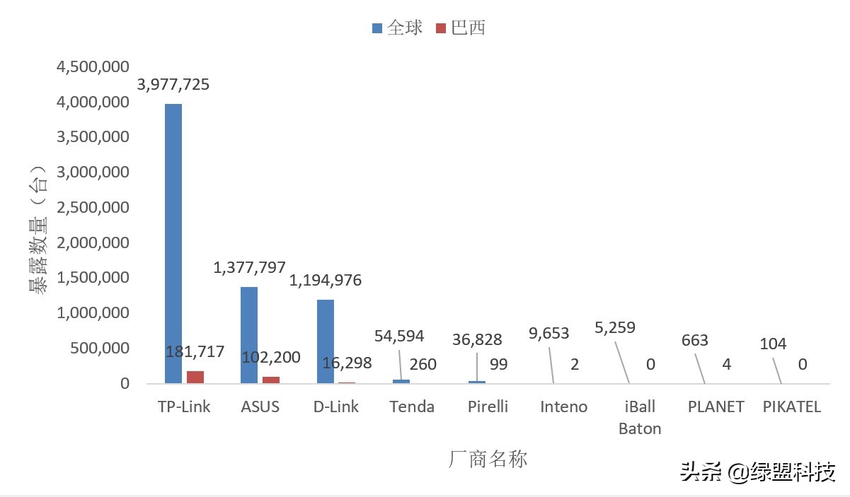 由于厂商设备型号众多,未被披露的型号同样可能存在相同的漏洞。从厂商角度来看,TP-LINK、ASUS和D-Link路由器的全球暴露数量均超过百万,而在巴西,这三个厂商的设备也有一定的暴露面。