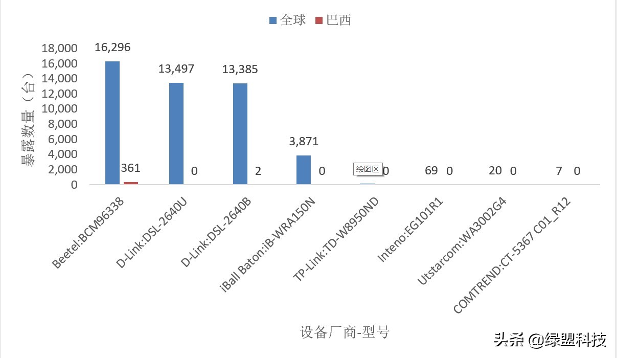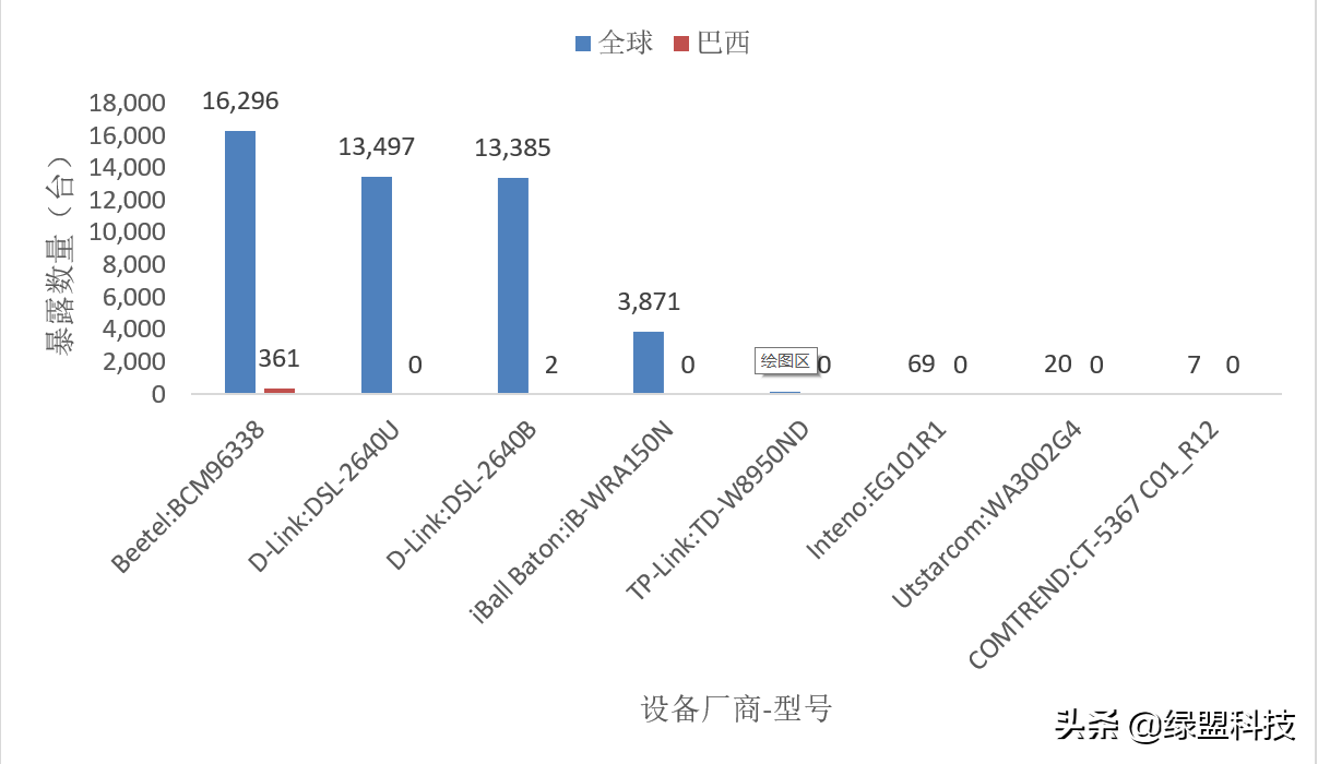通过Exploit-DB,我们可以获取存在远程DNS修改漏洞的设备厂商和型号,因此,本节将从这两个角度对潜在受影响的设备进行评估,数据来自绿盟威胁情报中心。由于劫持目标与巴西有关,除分析全球受影响情况外,我们也对巴西的受影响设备的分布情况进行了分析。