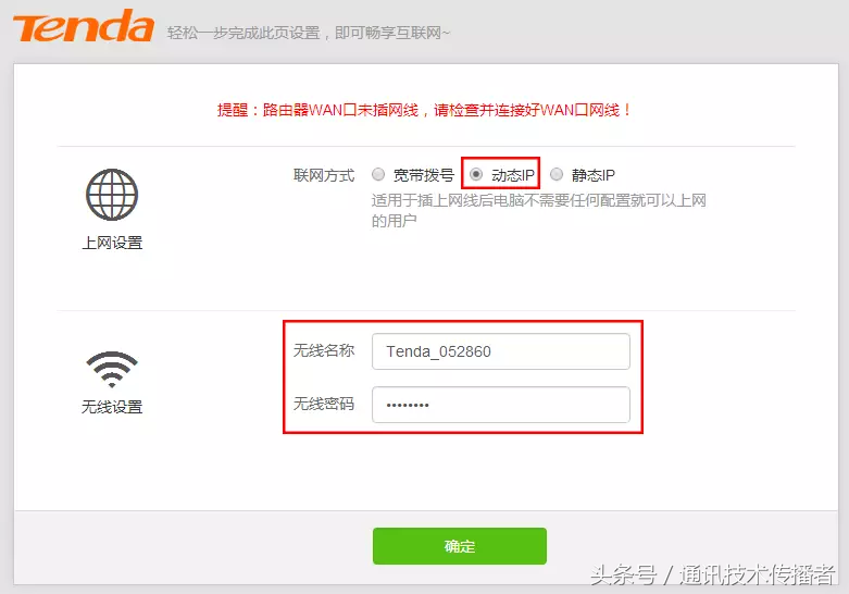 选择“动态IP”,修改无线名称和密码,然后按确定即可。