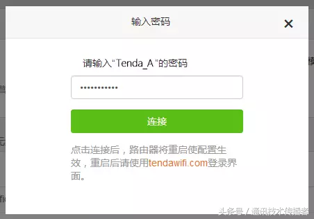 4.选择主路由的WiFi信号(Tenda_A)后,输入主路由的WiFi密码(12345678000),点击【连接】。