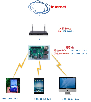 该实验主要目的是让树莓派的有线网卡(eth0)连接Internet,然后让无线网卡工作在热点模式(AP,Access Point)提供接入,这样我们的手机、电脑等就可以通过无线连接树莓派上网了。通过该实验,我们可以了解手机电脑开热点、以及无线路由器的工作原理,同时也会对计算机网络有更加深入的认识。下面是我们实验的网络拓补图: