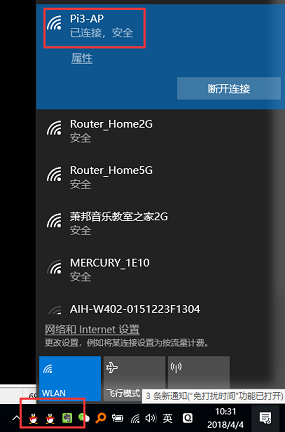 通过笔记本或电脑会发现 无线AP Pi3-AP,但是连接不上,这是因为树莓派的无线网卡并没有开启 DHCP和DNS服务器,接下来我们配置dnsmasq。