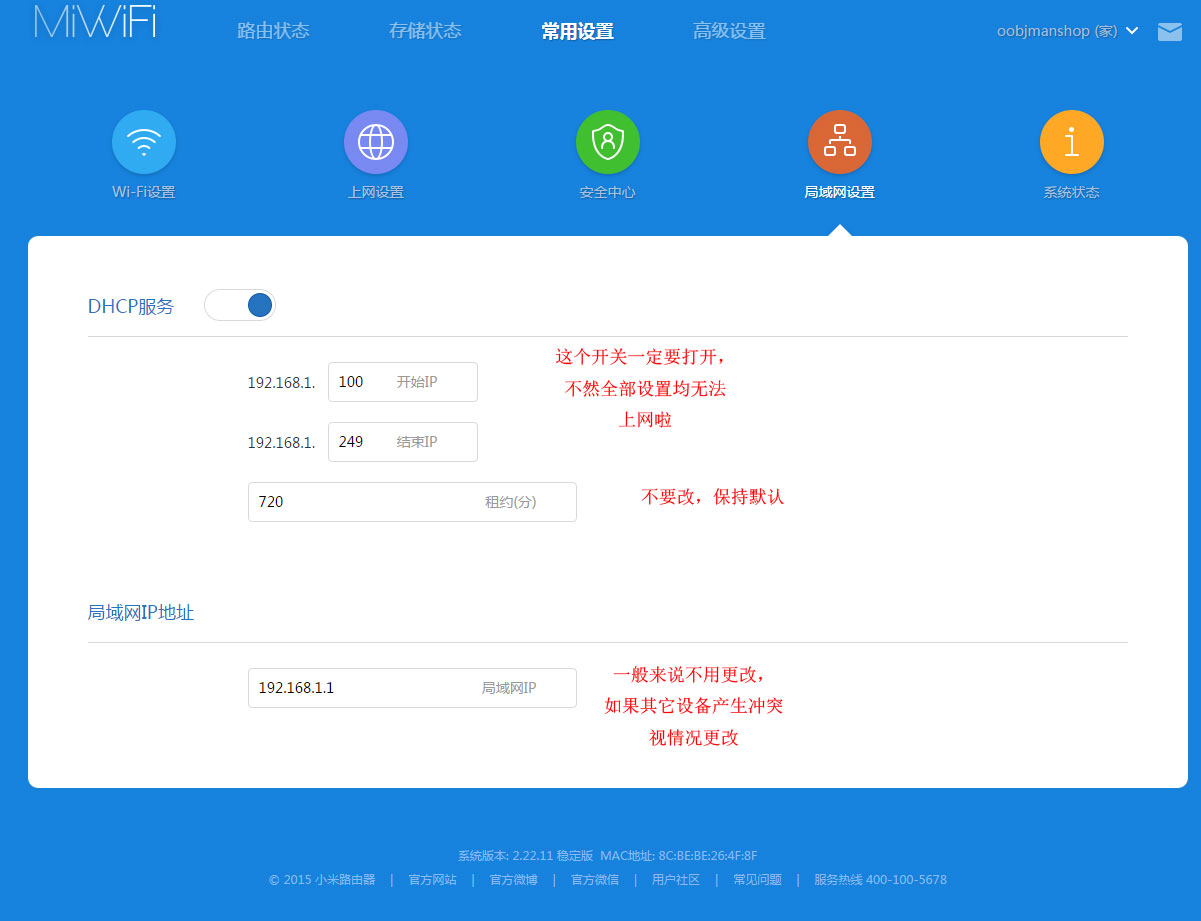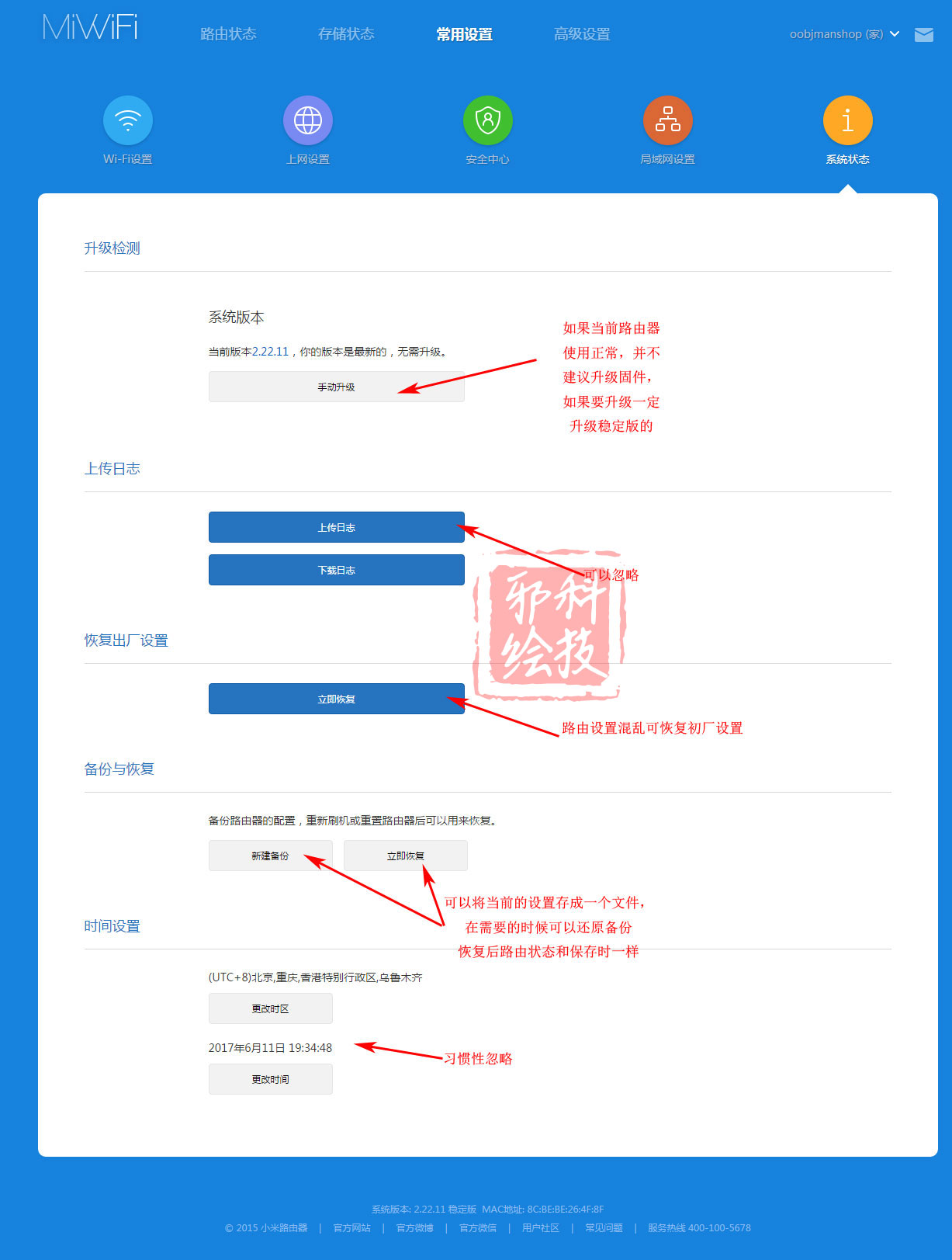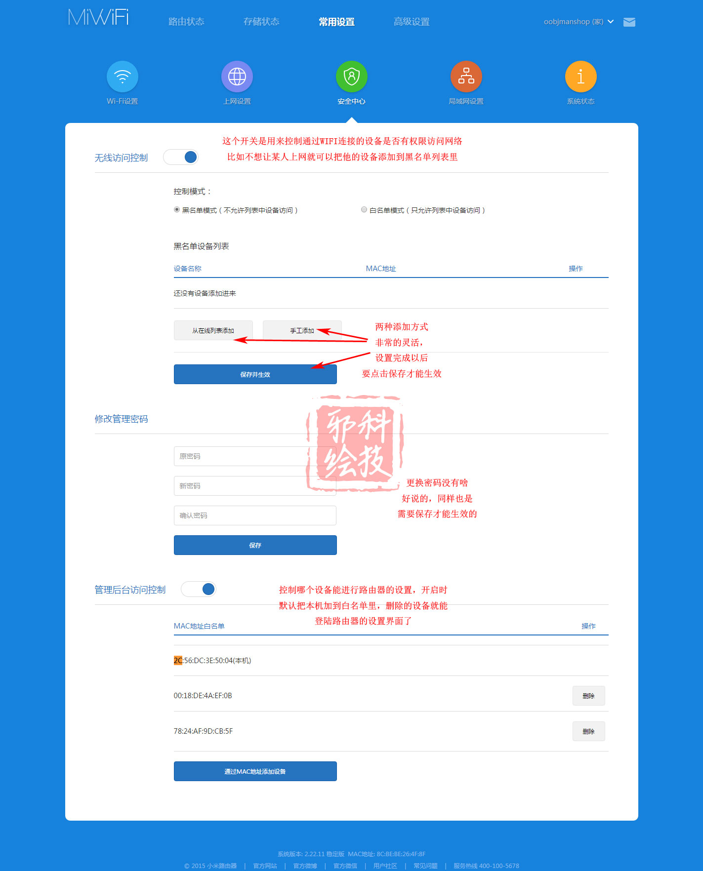 本期主要讲解小米路由中基本设置里的内容,分为WIFI设置、上网设置、安全中心、局域网设置和系统状态。内容相当多,不说废话直接上图啦(基本全是图,图上的字全是手工码的哟)。