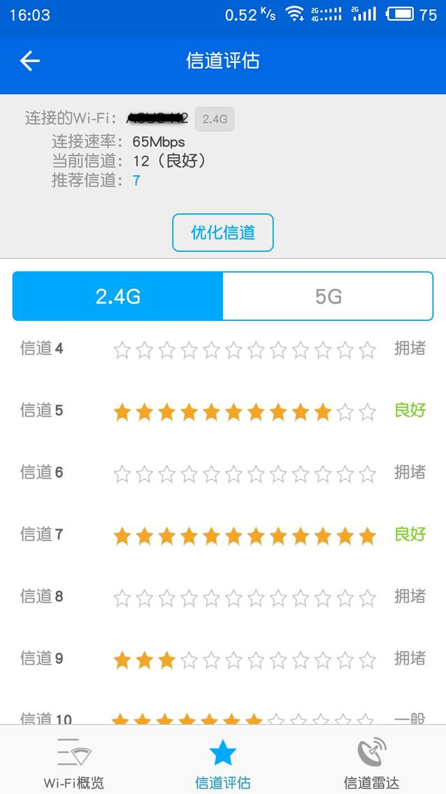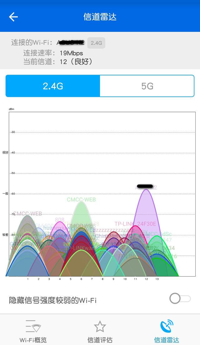 2、用wifi分析类软件,安装到手机上,打开软件扫描周围无线路由器信号,软件会直观显示干扰较少的信道。