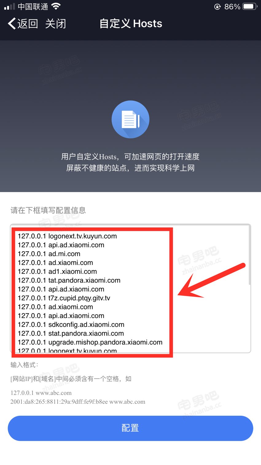 三、在配置框内粘贴下方代码,完成后点击配置按钮。(代码由知乎用户@Alexreal提供 原文链接)