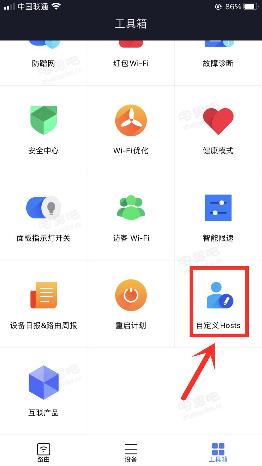 二、打开右下角“工具箱”,点击“自定义Hosts”按钮。(如果没这个按钮,说明您没有在APP内添加wifi。)