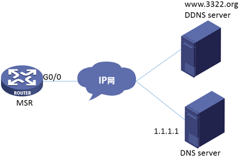 #在MSR路由器公网(拨号口)接口下指定应用DDNS策略3322.org,更新域名whatever.3322.org与接口主IP地址的对应关系,并启动DDNS更新功能