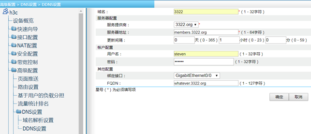 #在弹出的设置页面进行如下配置:其中域名用于唯一标识一条DDNS信息,可以任意设置,这里设置为“3322”。服务提供商和服务器地址根据实际情况选择,这里选择为默认的“members.3322.org”。用户名密码设置为登录DDNS服务器的用户名和密码(账户名为steven、密码为nevets)。绑定接口选择设置该DDNS所绑定的MSR路由器的公网接口(GigabitEthernet0/0),FQDN设置为申请的域名“whatever.3322.org”,然后单击<确定>