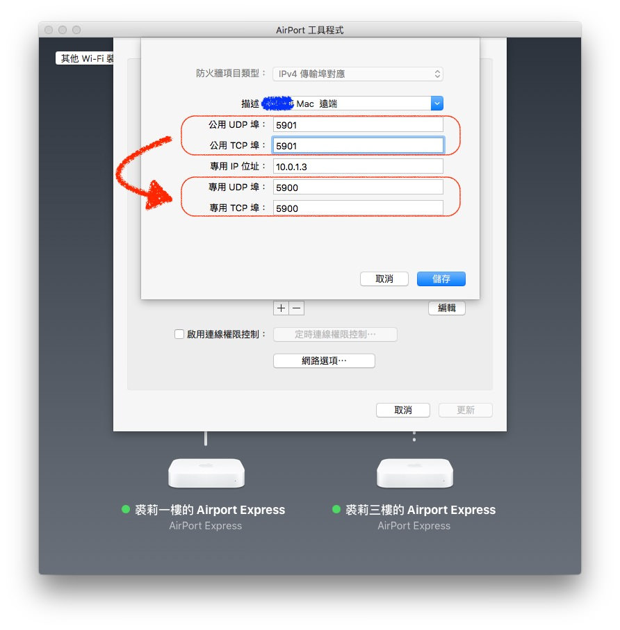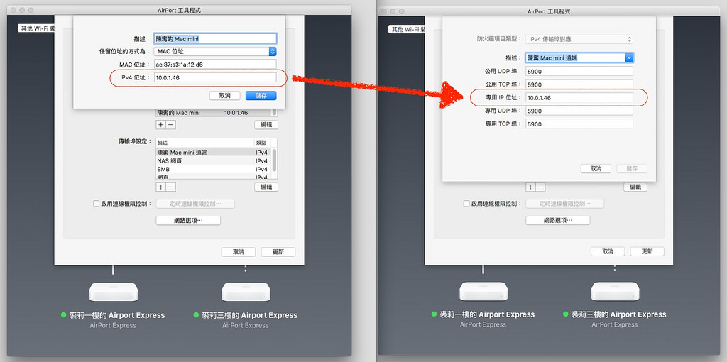 举例来说,如果我希望 10.0.1.46(电脑 A)、10.0.1.3(电脑 B) 这两台电脑都能远端,那么我可以先将电脑 A 的公用埠与专用埠都设定为 5900,这样我从外头的网路直接用 Safari 的 VNC 功能(教学请见这里)就可以直接透过我家的 IP 远端电脑 B 了;接下来,我再把电脑 B 的公用埠设定为 5901、专用埠设定为 5900,这样我只要在外头连回家中时额外加上「5901 Port」的设定,就可以透过另一个通讯埠连回家中路由器,再由家中通讯埠连到电脑 B 的 5900 通讯埠,就能让两台电脑都能直接从外头远端桌面啦!