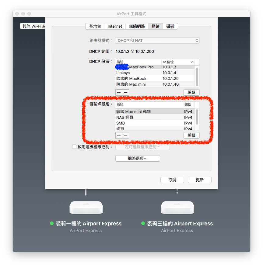 接下来我们要填入我们要转向的目标区网 IP 与通讯埠号码(port)。区网 IP 请参考你预先绑定的 IP,例如我把「陈寗的 Mac mini」绑定在 10.0.1.46 这组 IP 上,而我未来也打算要远端这台电脑,那么在刚刚按了加号按钮之后跑出来的视窗里就得在「专用 IP 位址」的栏位里面填上刚刚绑定的 10.0.1.46 这组 IP。