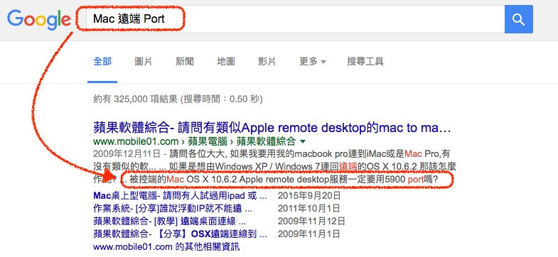 只要在 Google 搜寻框上打入你的电脑作业系统、网路服务、以及 Port(英文单字),就可以像上图这样快速的查出你该使用哪个通讯埠号码了。例如我要查询 Mac 远端桌面服务所使用的通讯埠,我就只要输入「Mac 远端 Port」,就可以快速找到我所需要的号码了。