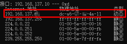 3)Windows下Win+R输入cmd打开cmd命令窗口,执行arp –a命令,搜索ip。在以太网2的ip接口下(192.168.137.xxx)有如图所示的ip地址和物理地址,则该ip就是树莓派的实际ip地址。