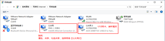 一般台式电脑和笔记本电脑只有一个以太网网卡,以太网方式连接树莓派会占用以太网接口,因此USB网卡可作为树莓派的连接网口。电脑使用USB网卡与树莓派连接,同时通过电脑本地网卡共享网络给USB网卡,这样树莓派也可以访问网络了。