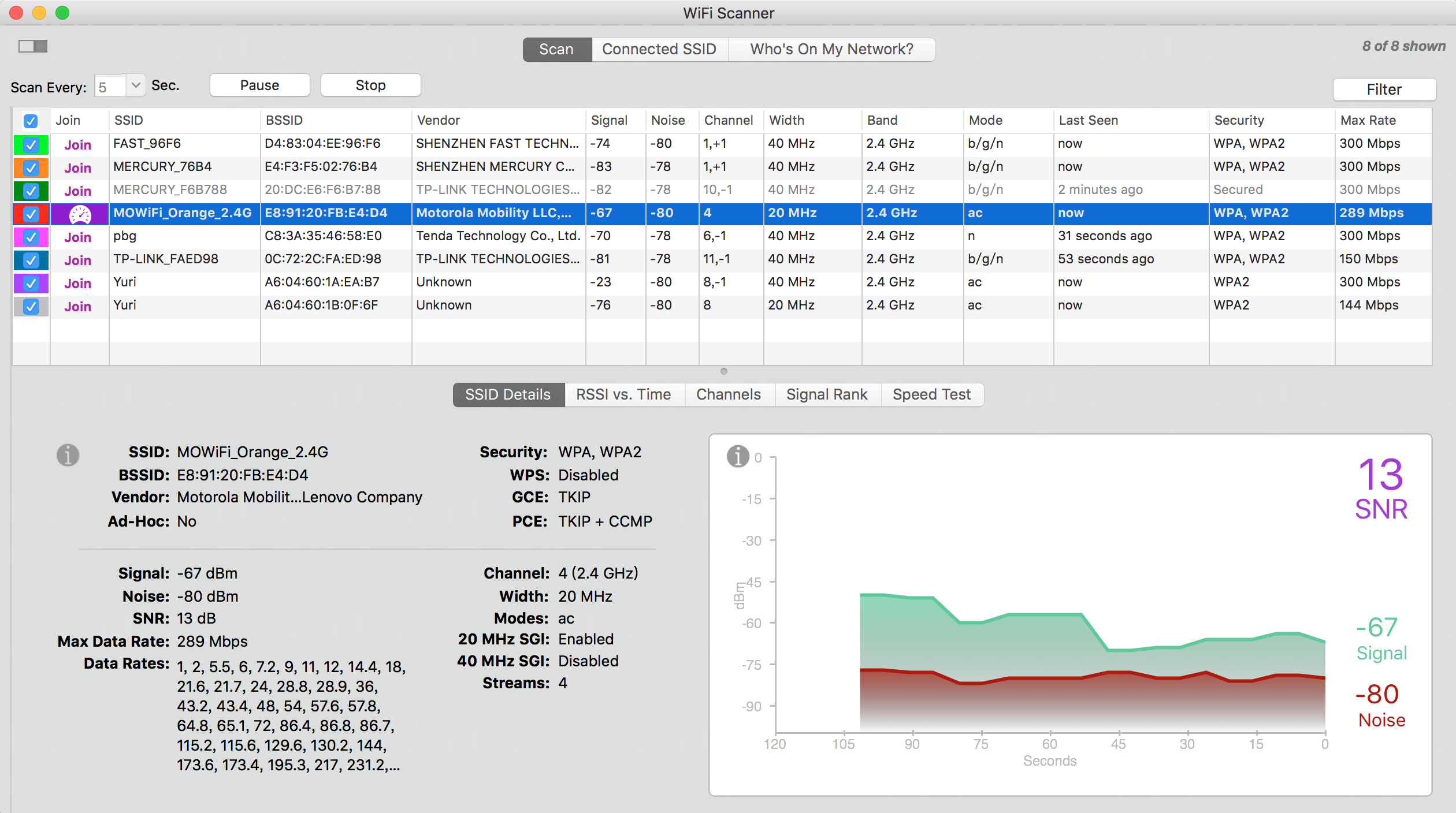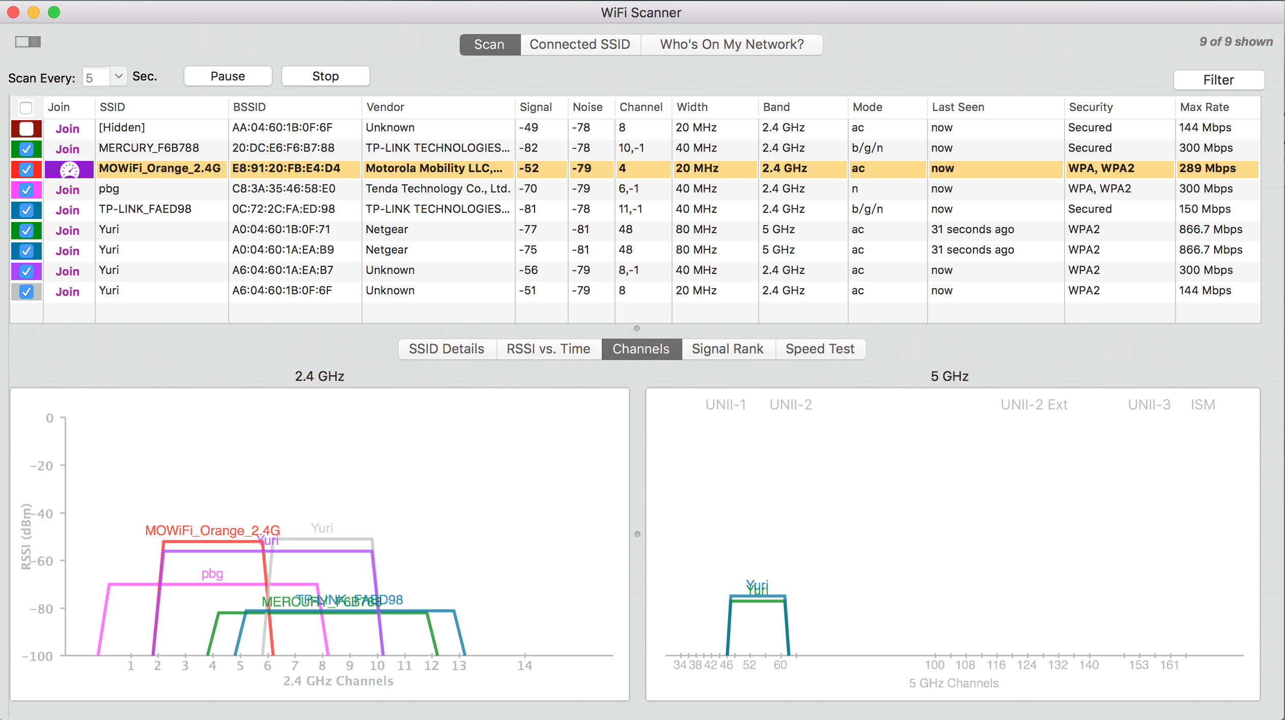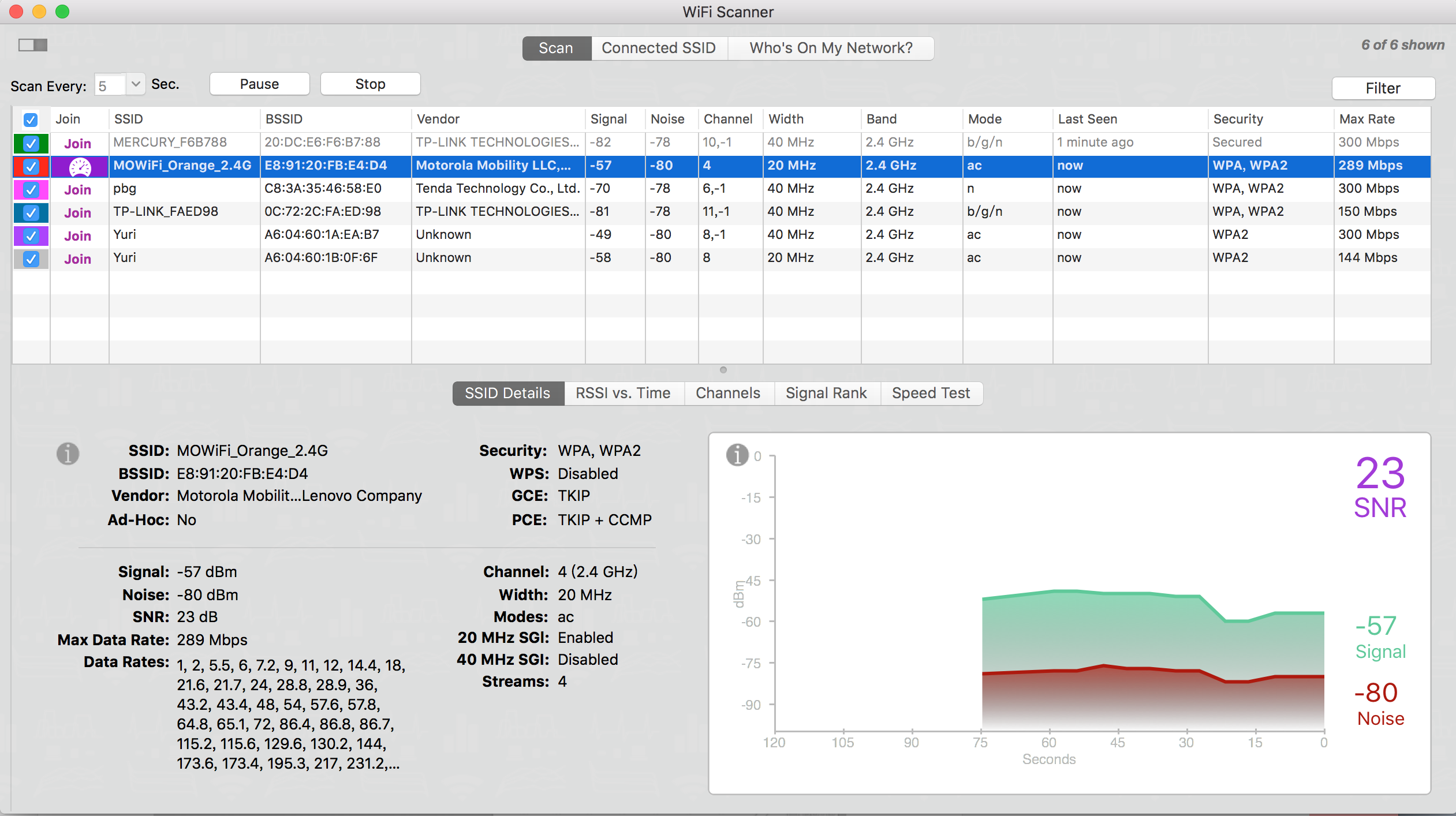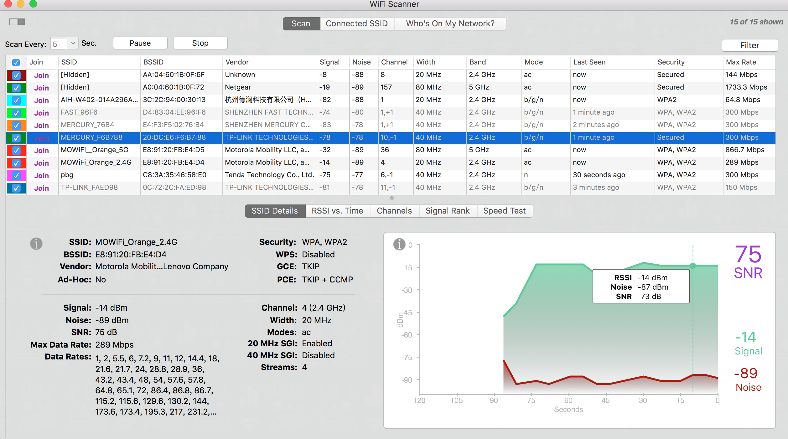 我使用了mac上专业的无线信号软件Wifi Scanner进行测试,分别是5m,无墙;10m,有墙;15m,有墙三种情况。测试结果令人满意,特别是2.4Ghz,即使到了C点,依然保持着不错的速率;但是5GHz频段无线信号自身穿墙较弱,基本到了B点就没办法测到了。