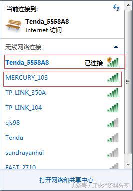 一个是自己的路由器,默认的无线网名称是Tenda_558A8,目的是将连接MERCURY_103并以后只连接Tenda_558A8就可以正常上网。