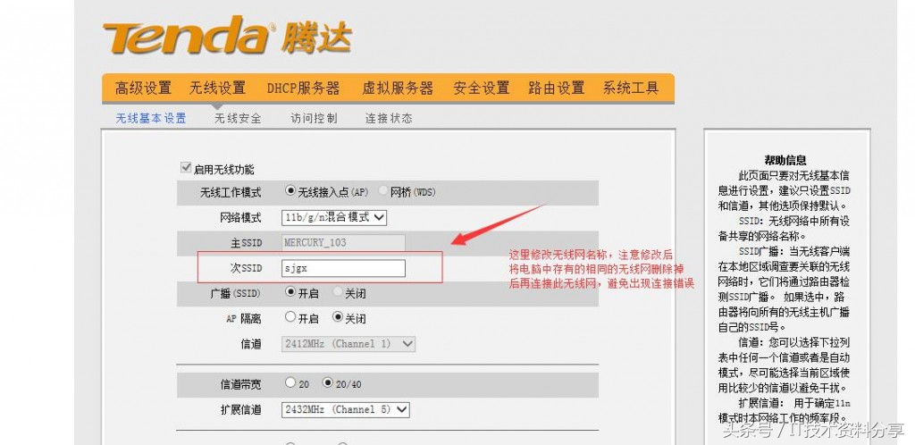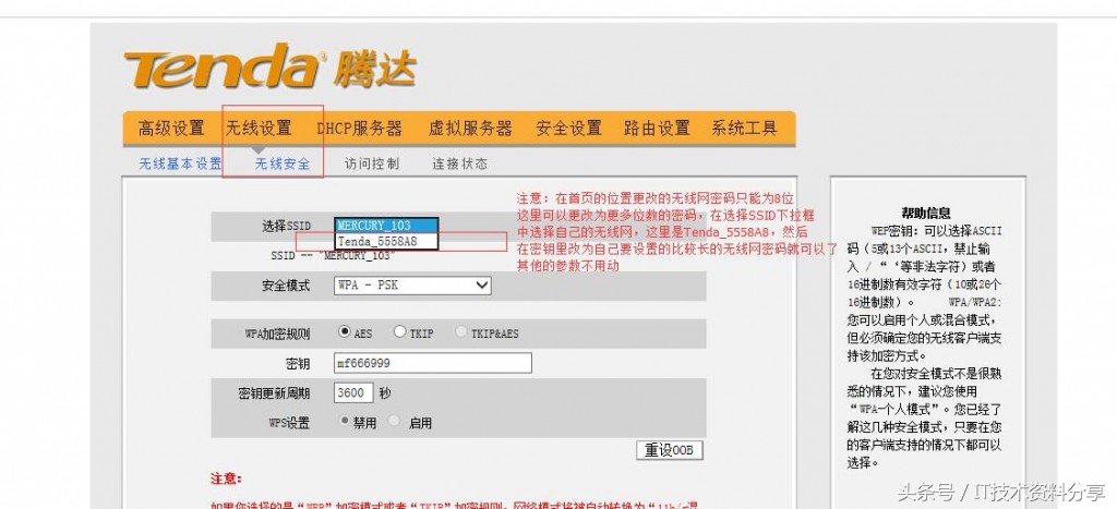 选择顶部的无线设置-二级导航选择无线安全-进行详细的设置。注意SSID选择的是你的无线网wifi名称(Tenda_558A8) 你也可以更改自己的wifi热点名称,选择顶部的无线设置-二级导航选择无线基本设置-进行详细的设置。如下图所示