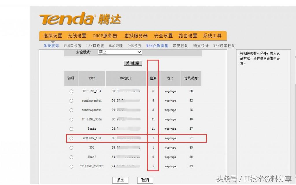 7.找到自己要桥接的那个路由器(MERCURY_103)因为是假设作为信号弱的路由器,这里的信号相对比较强(注意,后面的信号强度,数字越小信号强度越强)