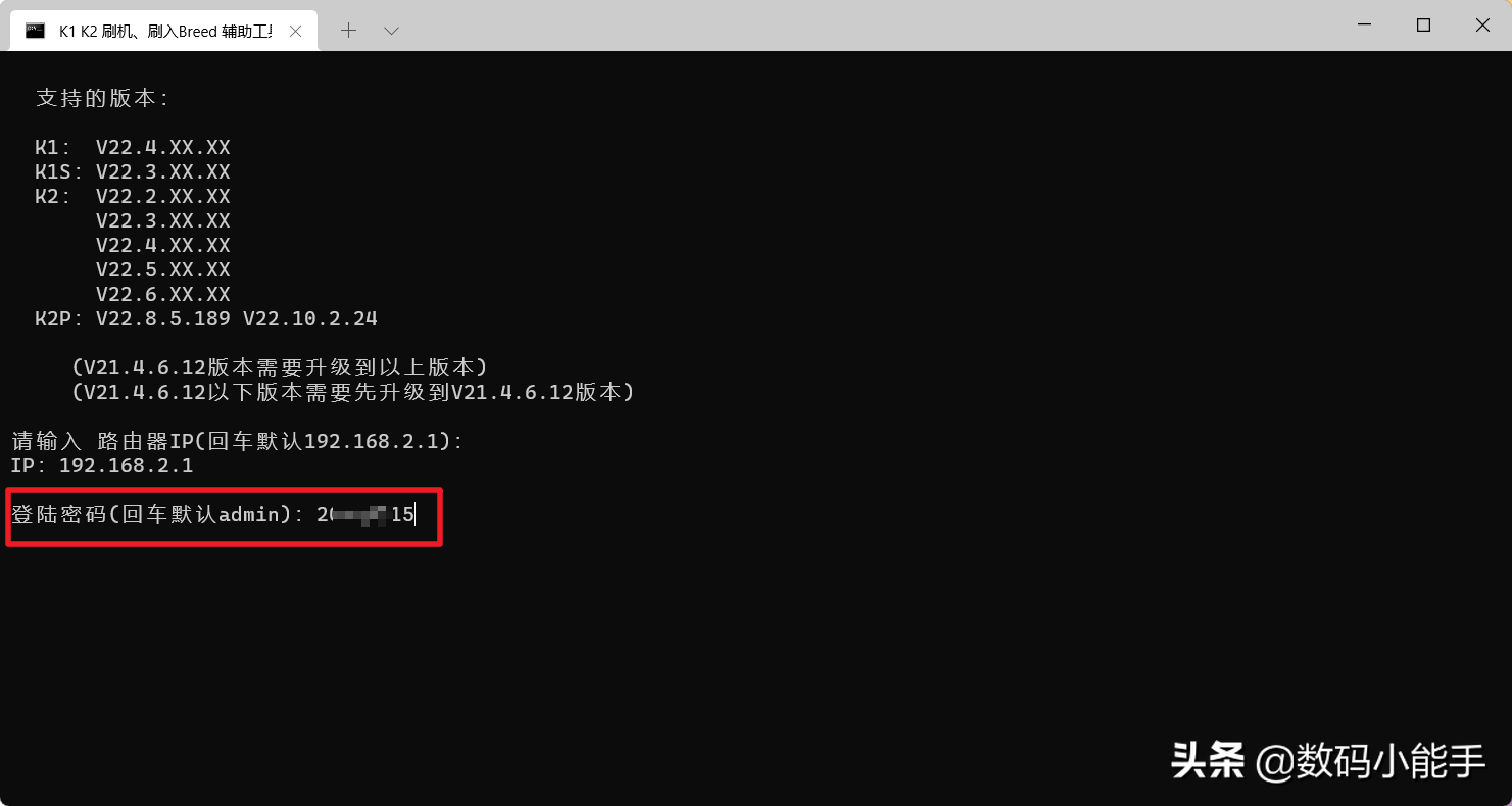 然后在输入路由器的登录密码(也就是你路由器的管理页面登录密码)。如果你的K2路由器是没有设置的,直接回车输入Y即可,程序会自动配置管理页面,这个时候管理密码会被配置为:tbvv.net。