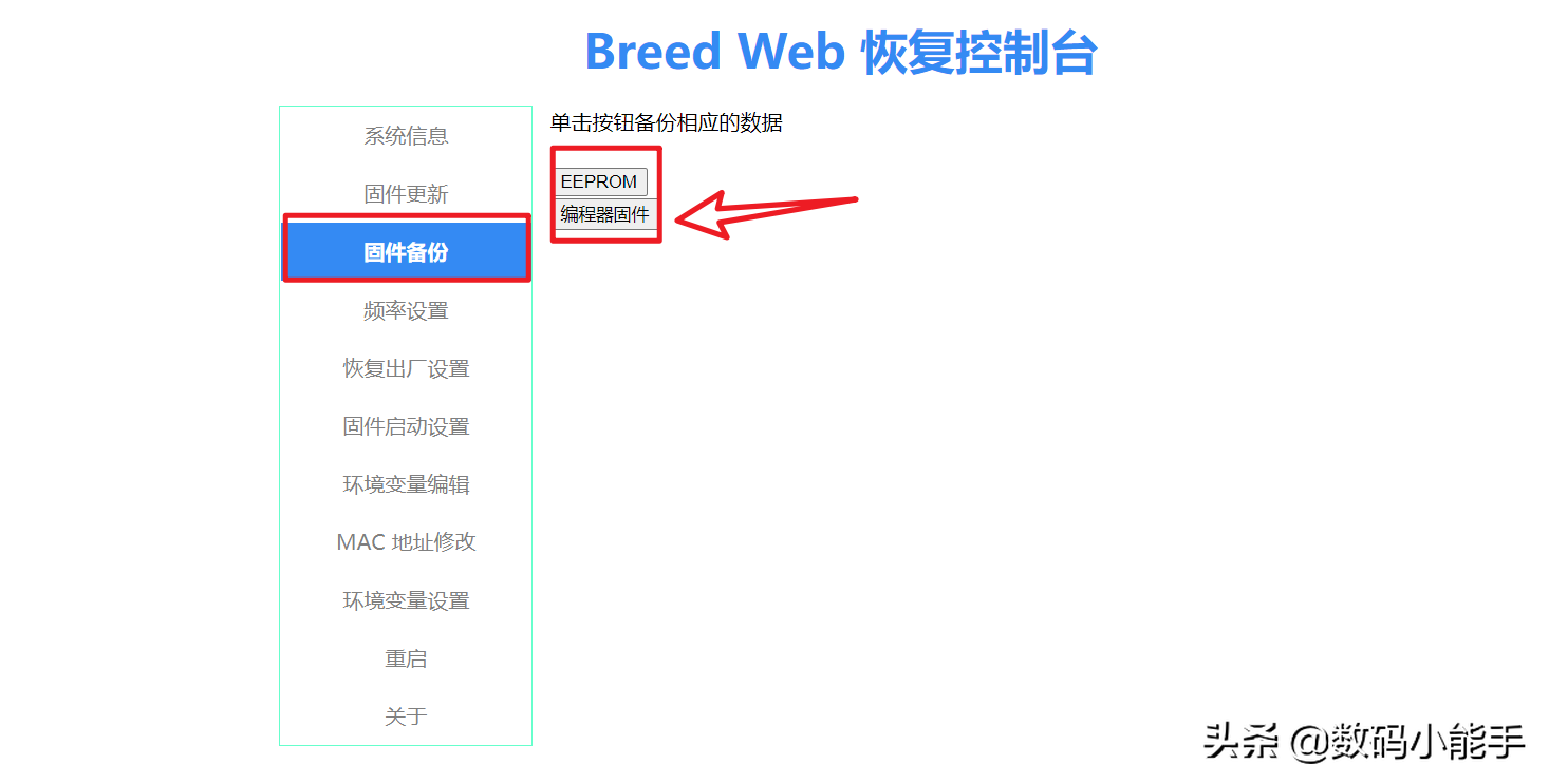 当我们首次打开breed控制台的时候,强烈建议备份编译器固件和EEPROM,这个是以防万一,以后这个可是路由器“救砖”的重要数据。