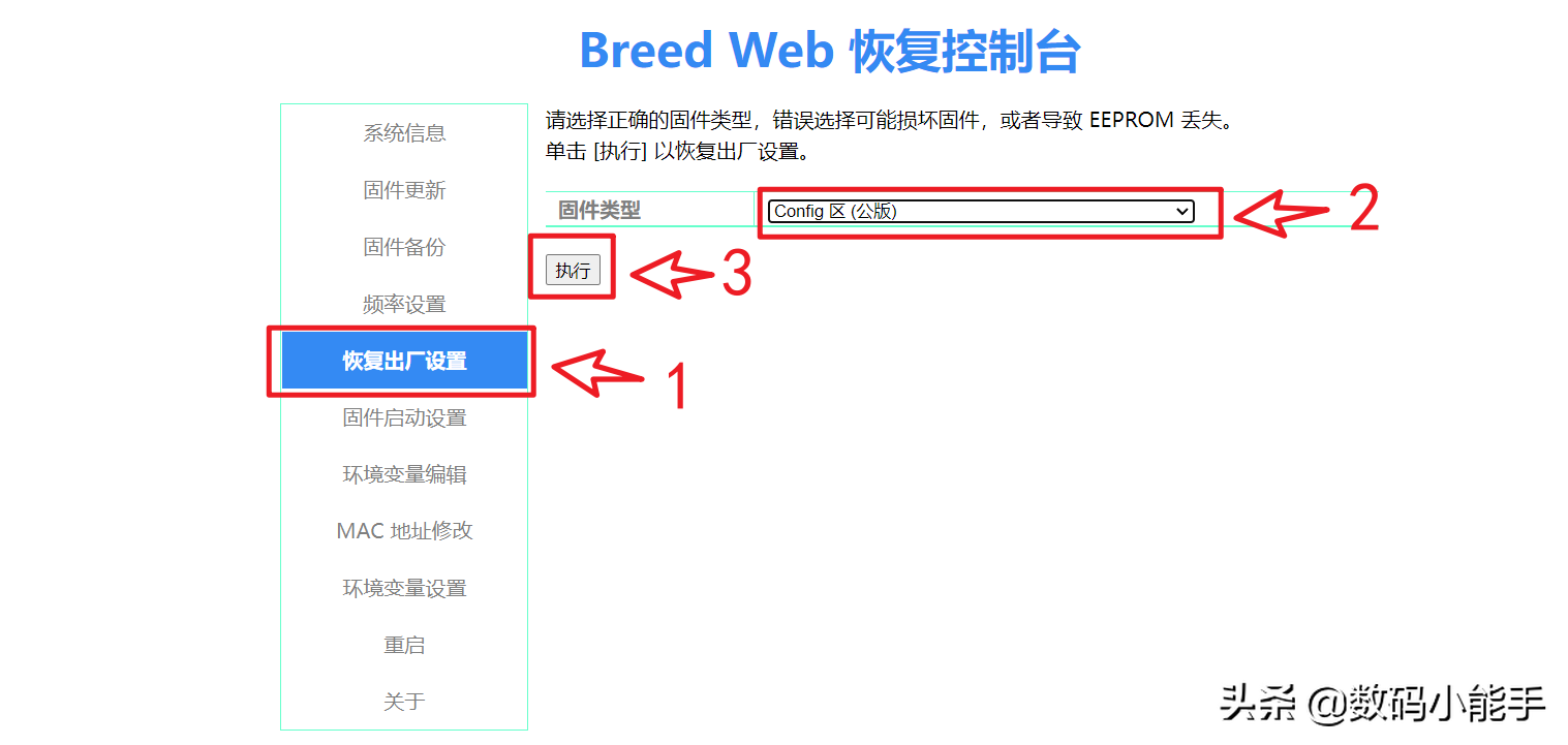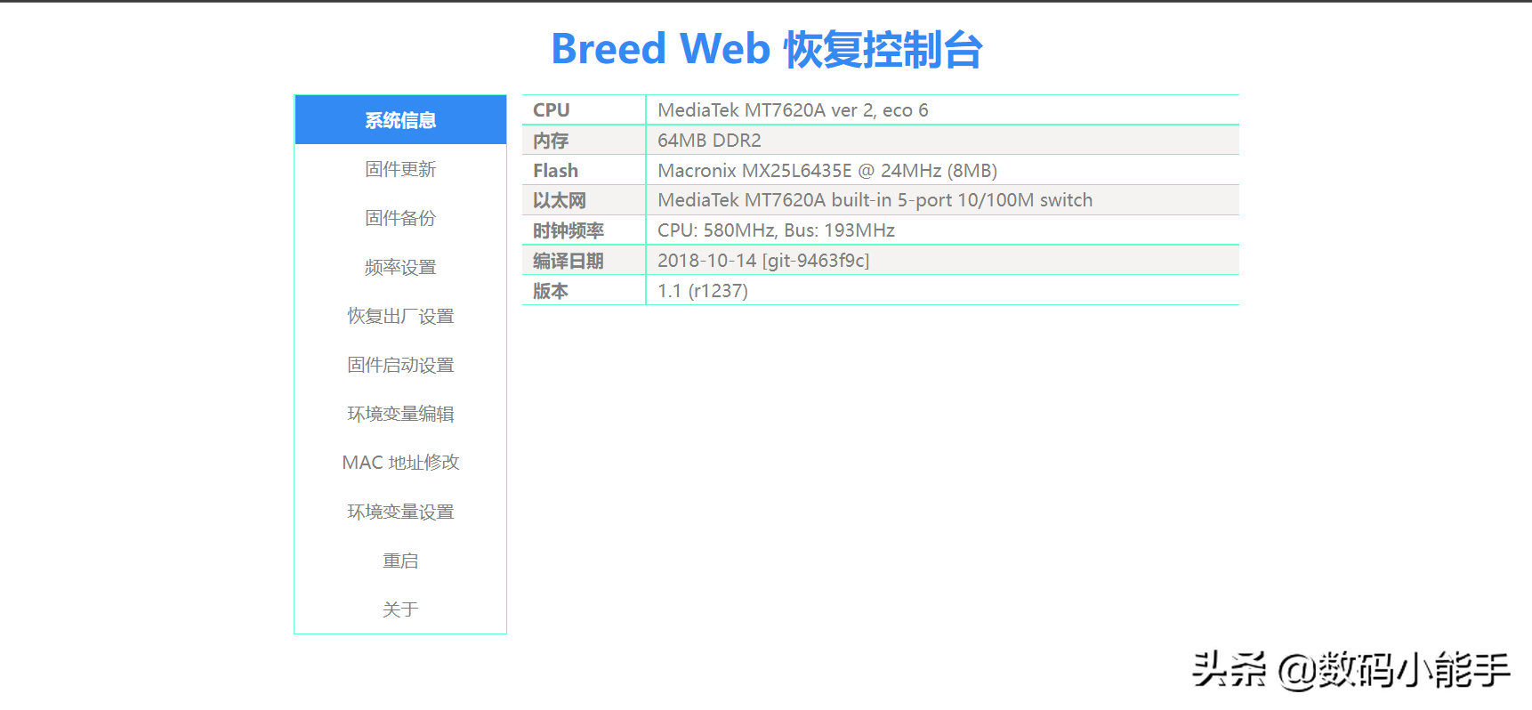 》》关于breed,简单来说其实就是我们以前玩安卓手机的REC模式,路由器在刷入breed以后,就可以通过breed刷如第三方固件。而且breed又被广大网友戏称“不死固件”,是因为刷入路由器刷入breed以后,之后我们刷的第三方固件全部是在 breed 里面完成,然后我们可以随意折腾也不用担心路由器“变砖”而无法使用,就算你刷错固件路由器没反应,我们也可以重新进入breed刷入一个可以启动的固件就可以了。