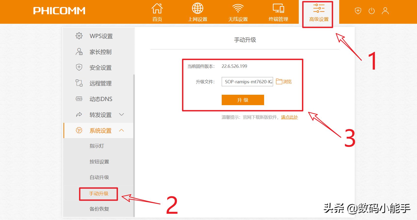 找到固件以后,也是登录路由器的管理界面,选择高级设置--系统设置--手动升级,选择你下载下来的对应的固件,点击“升级”按钮就可以直接升级了。