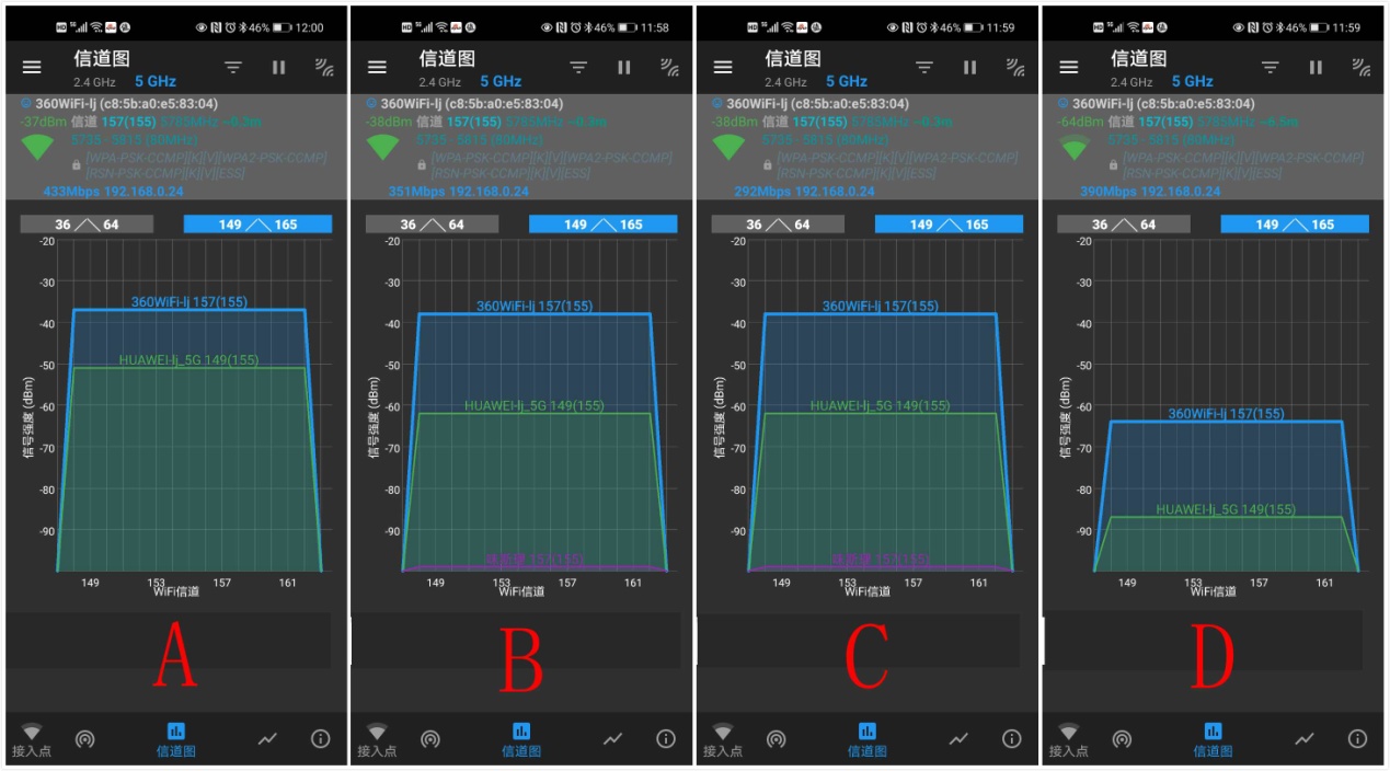 真正的重点来了,D点的测试位置基本上算是个通讯死角,可以看到旧路由的信号几乎被淹没,而360家庭防火墙路由器V5X的表现让我非常的惊喜,这个日常卡断严重的地方,还能有如此强劲的信号,的确实属不易。