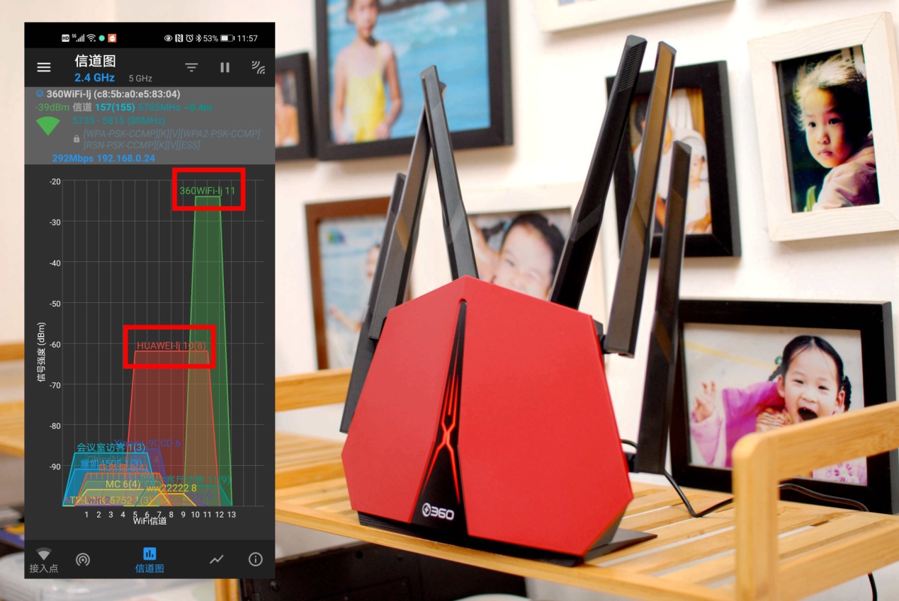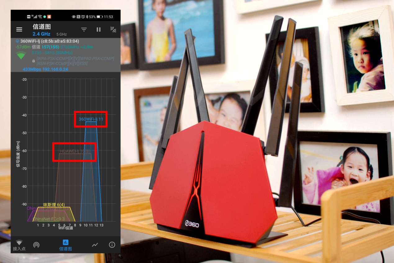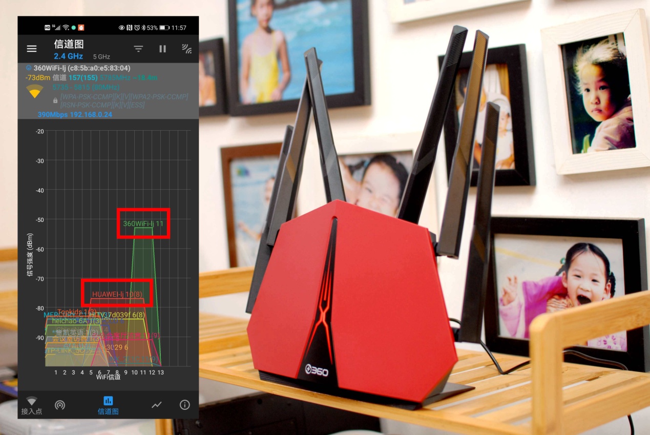 A点的2.4G信号的图表情况,从上图中可以明显的看到,在无任何阻隔的情况下360家庭防火墙路由器V5X,比旧路由器都高出不少,而且信号表现很强势。