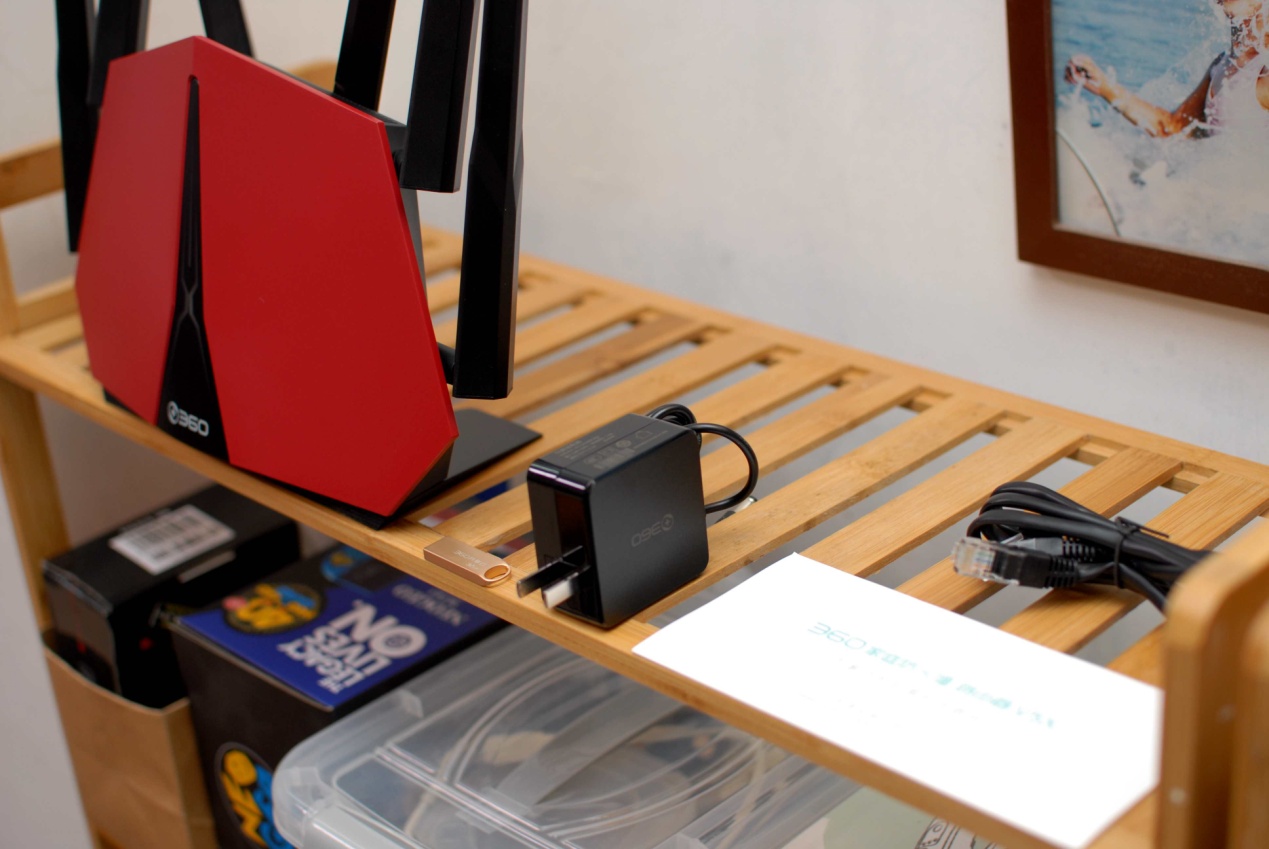 360家庭防火墙路由器V5X的全家福,主机(已安装底座)、32G的U盘、电源适配器、网线和说明书,话说配备的U盘必须给个好评,省却了另购的费用啊!
