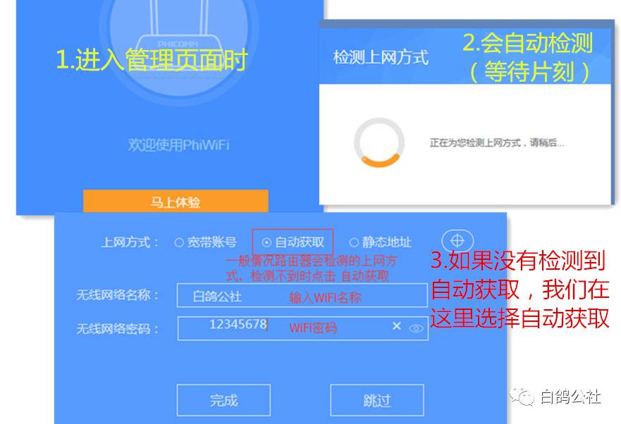 2.进入后,打开马上体验等字眼——路由器一般会自动检测上网方式——如果没有选择自动获取点击然后手动选择,输入WiFi名称和密码,点击完成。如下图: