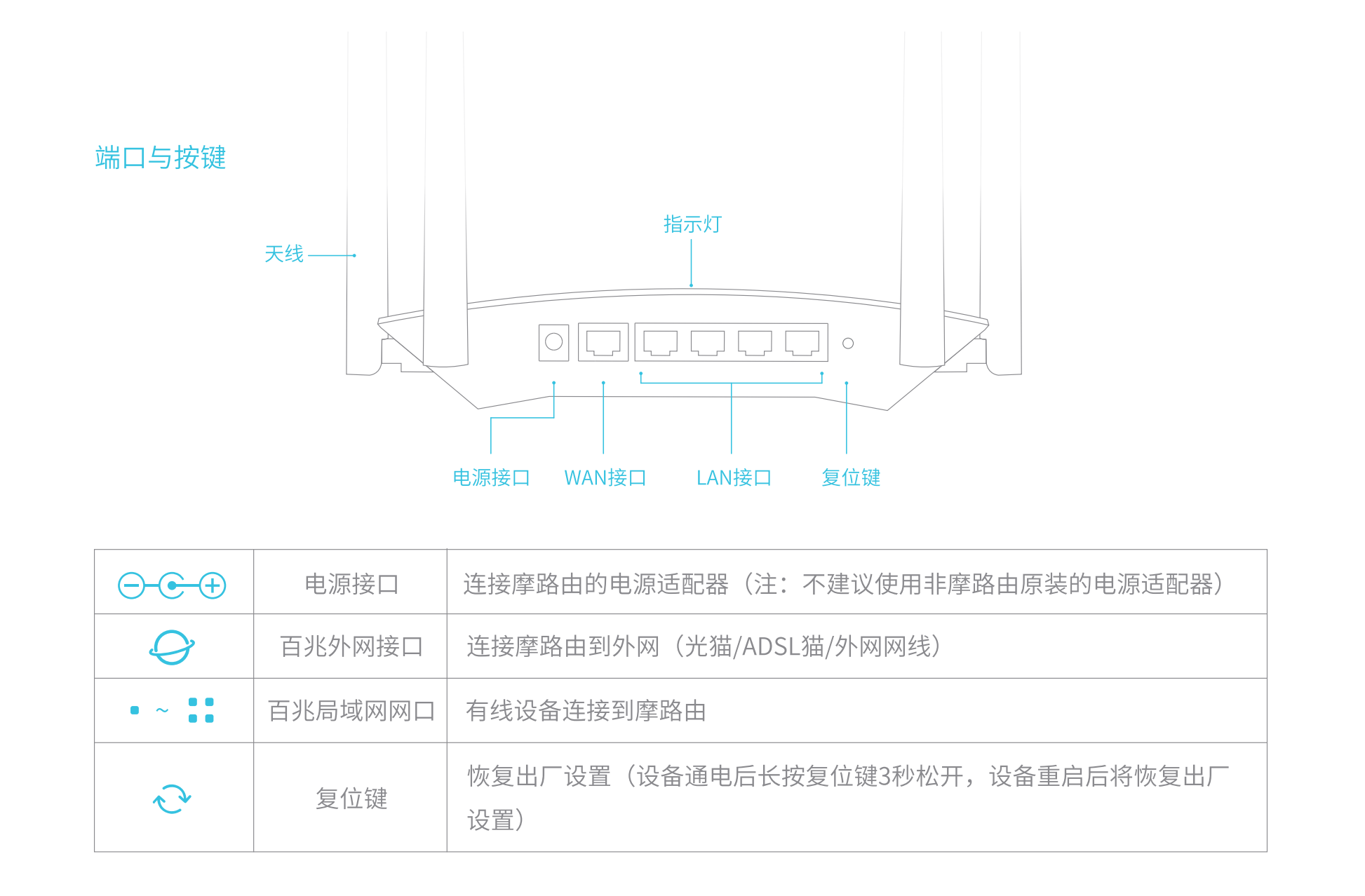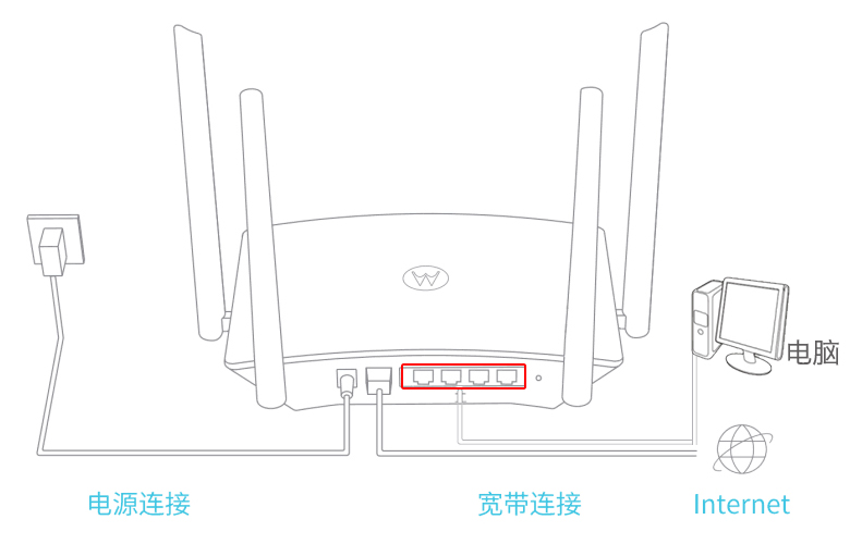 2.用网线从路由器蓝色网口(WAN口)连接至外网(如宽带猫、光猫等),如果您的猫有多个网口,请确保将路由器蓝色网口连接到猫正确的上网接口,若不清楚,请联系您的宽带运营商(如:电信、联通等)。