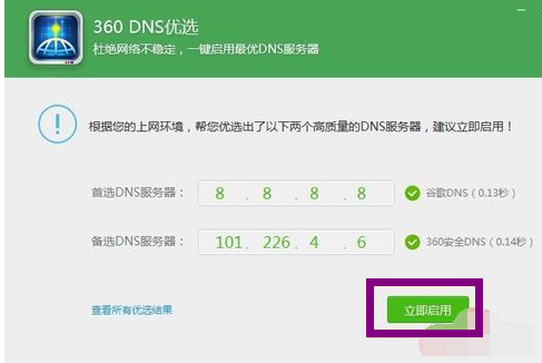 通过对多个DNS延迟的检测和判断,最终将找到延迟最短的最优DNS。您可以直接单击“立即启用”按钮,以使用当前的最佳DNS自动配置网络。