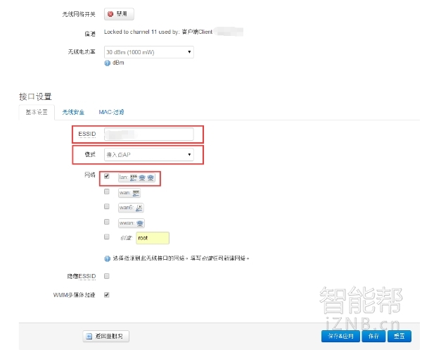 7、基本设置的ESSID填跟4300的SSID相同的名字,模式选接入点AP,网络选择lan。可以看到,上面的信道跟4300的信道也是一样的。先别急着保存,还有别的设置。