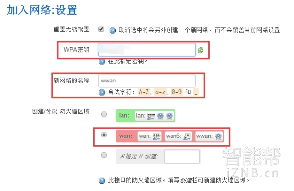 4、加入网络的设置里填上4300的无线密码,新的网络名称随便起,这里用默认的wwan。下面防火墙区域选择wan。